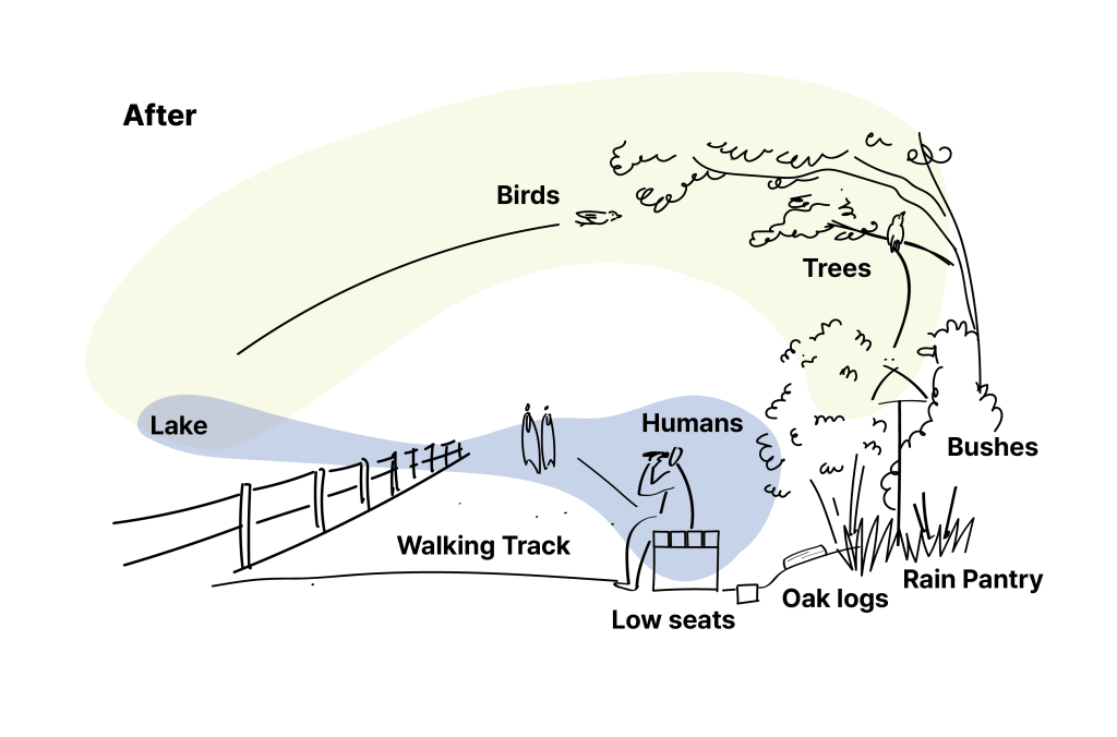 Instead of building a new garden from scratch, the project implements the necessary elements for both birds and people, respecting the park’s existing layout and financial constraints.