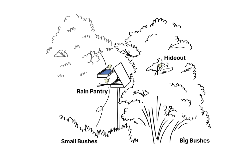 덤불 사이에는 빗물을 모으고 겨울철에는 씨앗 등의 먹이를 제공할 수 있는 선반(rain pantry)이 숨어있습니다.