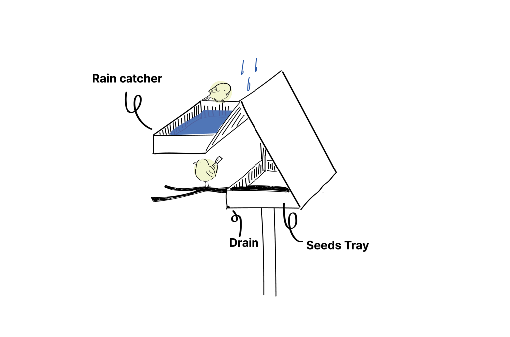 A rain pantry was also installed, serving as a shelf to hold water for birds to drink and, during the harsh winter months, to offer seeds and other food.