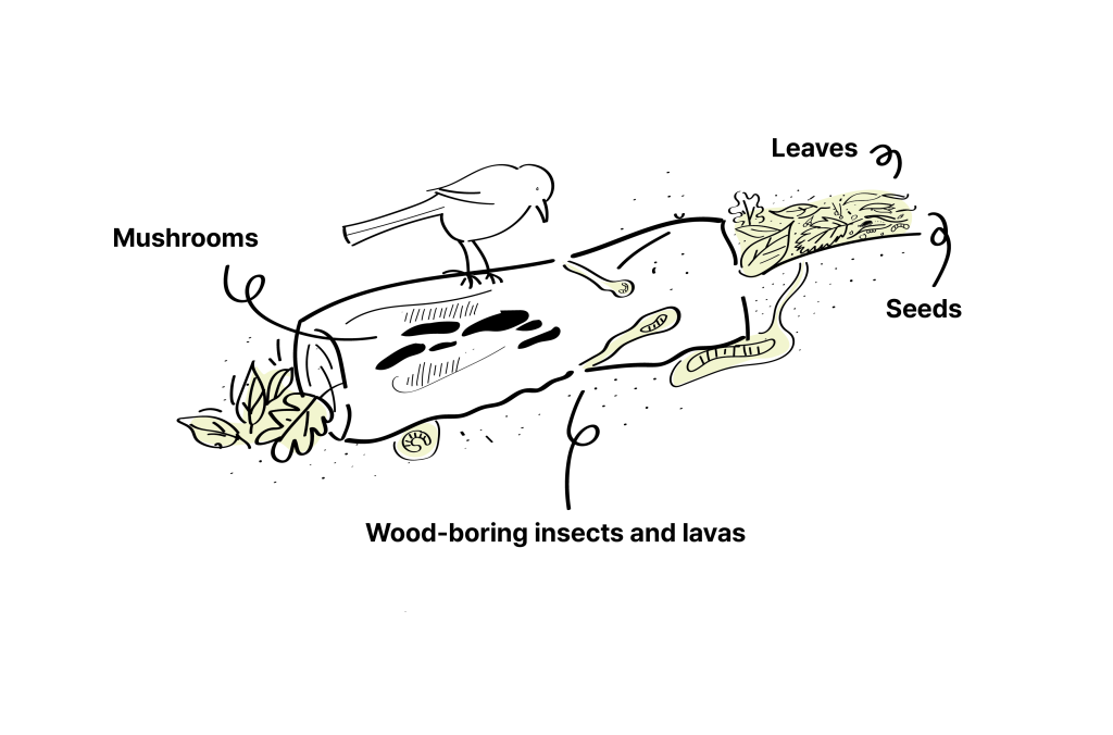 Oak logs were placed on the slopes to collect fallen leaves and keep the paths clear.Over time, the gathered leaf layers become a refuge for small creatures and natural seed beds.